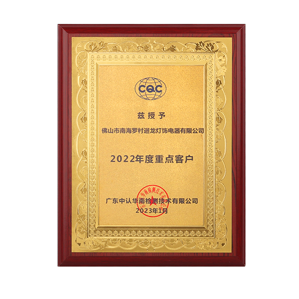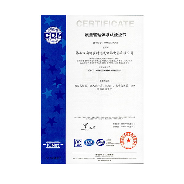 迴龍燈飾通過ISO9001國際質(zhì)量體系認(rèn)證,2010年被《環(huán)球市場》評定為GMC中國優(yōu)質(zhì)制造商,先后加入了南海照明協(xié)會、CSA國家半導(dǎo)體照明工程產(chǎn)業(yè)聯(lián)盟、廣東省照明學(xué)會等,產(chǎn)品通過CCC、CQC、CE等認(rèn)證。