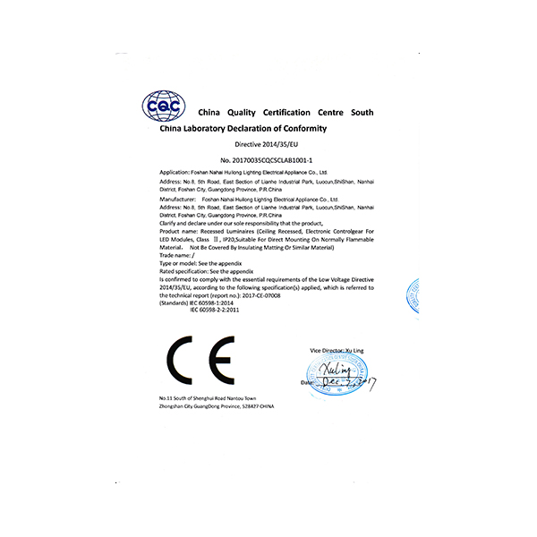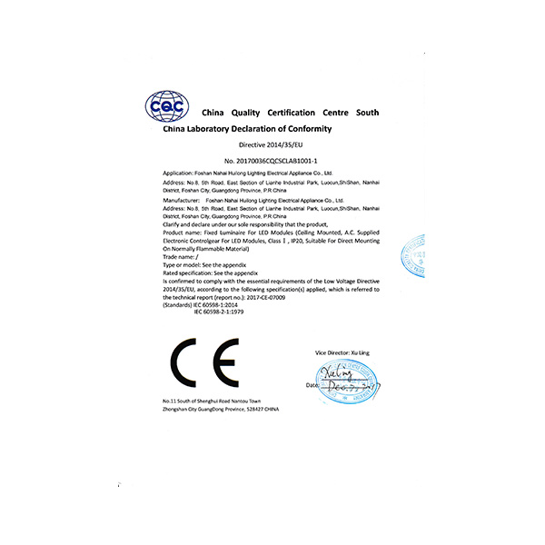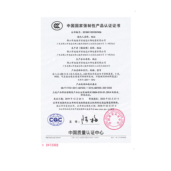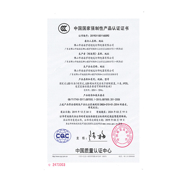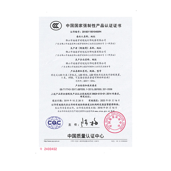 迴龍燈飾通過ISO9001國際質(zhì)量體系認證,2010年被《環(huán)球市場》評定為GMC中國優(yōu)質(zhì)制造商,先后加入了南海照明協(xié)會、CSA國家半導(dǎo)體照明工程產(chǎn)業(yè)聯(lián)盟、廣東省照明學(xué)會等,產(chǎn)品通過CCC、CQC、CE等認證。