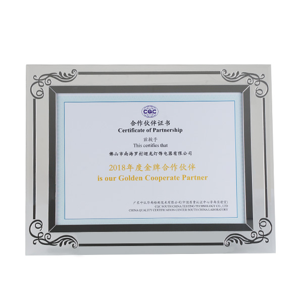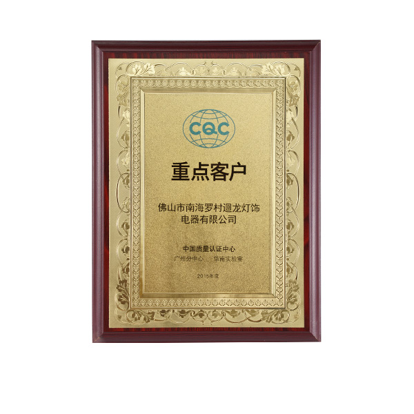 迴龍燈飾通過ISO9001國際質(zhì)量體系認(rèn)證,2010年被《環(huán)球市場》評定為GMC中國優(yōu)質(zhì)制造商,先后加入了南海照明協(xié)會、CSA國家半導(dǎo)體照明工程產(chǎn)業(yè)聯(lián)盟、廣東省照明學(xué)會等,產(chǎn)品通過CCC、CQC、CE等認(rèn)證。
